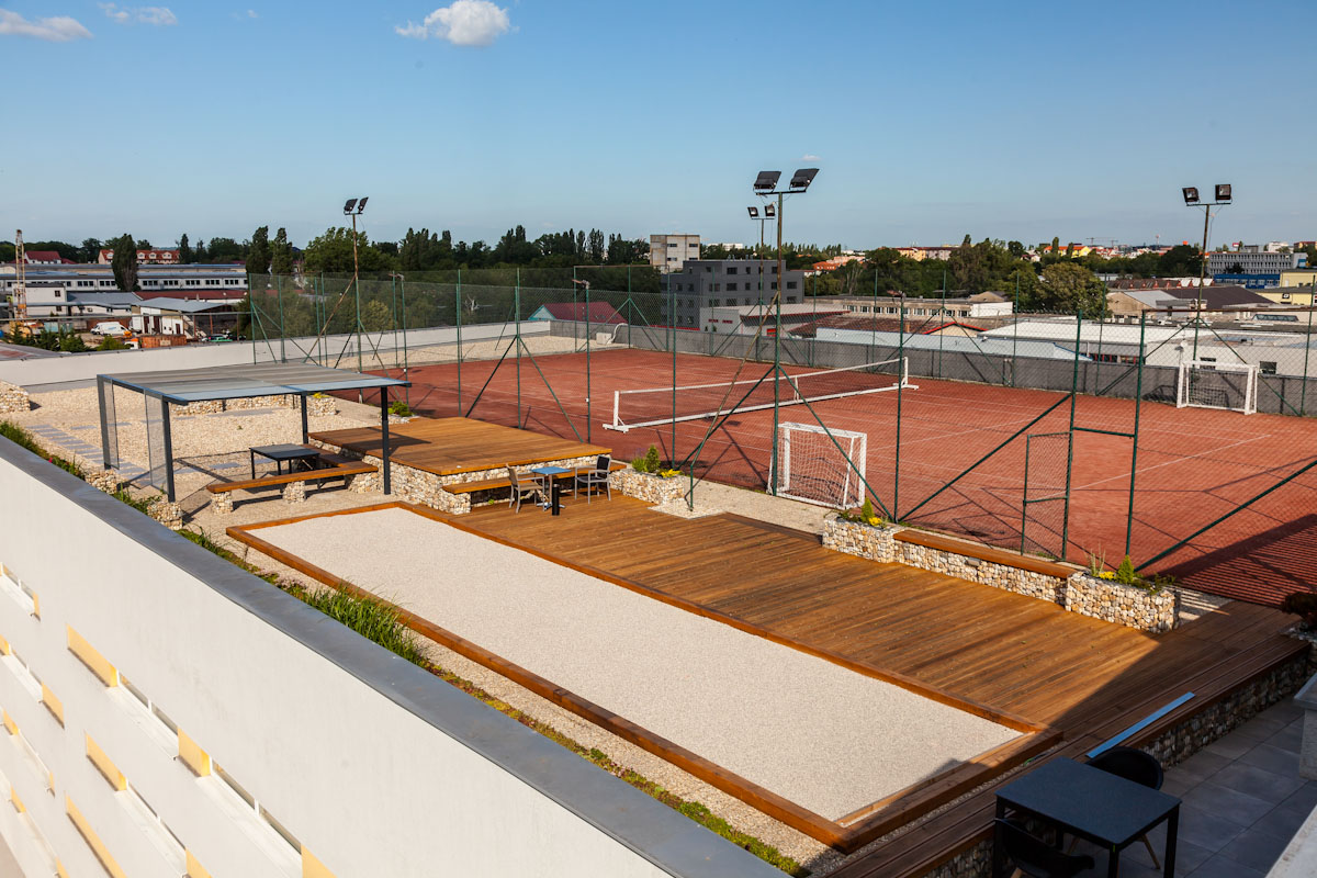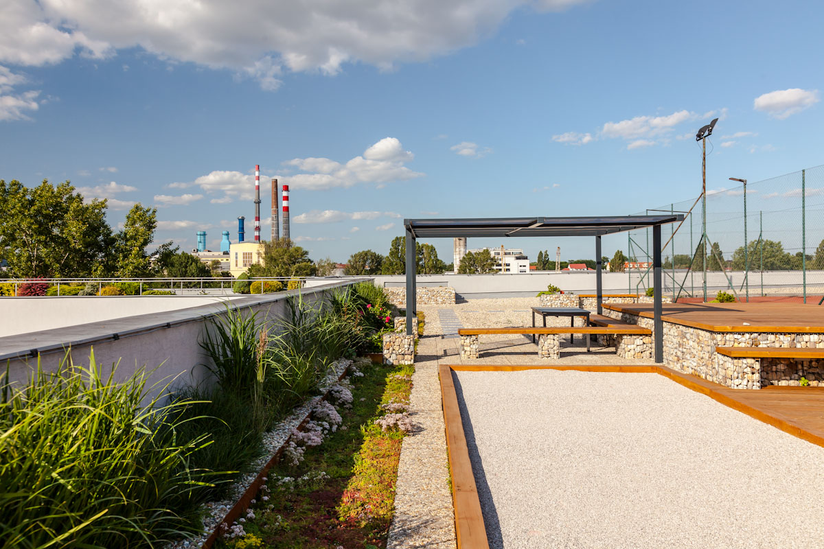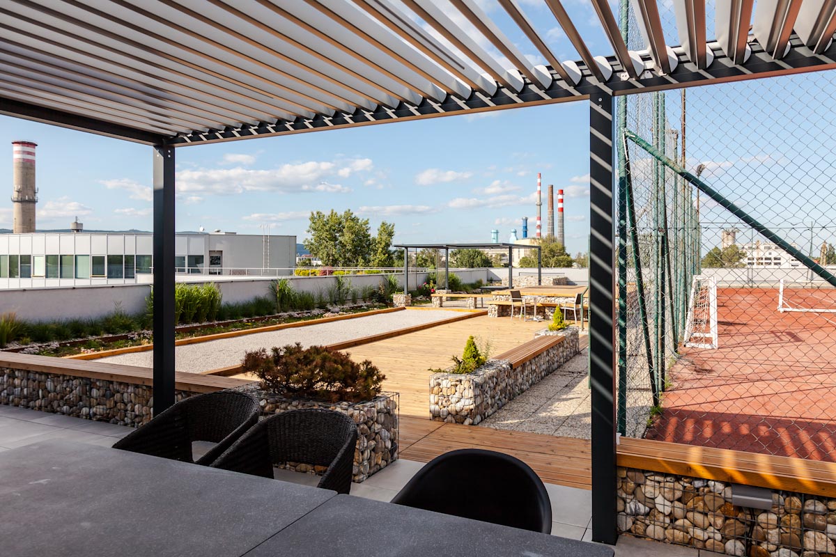 Už ste hrali tenis na 4. poschodí s panoramatickým výhľadom na mesto? IP CENTRUM ponúka ďalšie výnimočné riešenia v podobe multifunkčných zelených striech, kde si priamo na streche budovy môžete užiť zeleň a zahrať tenis, basketbal, futbal, petang, šípky alebo stolný tenis. Súčasťou “strešného” areálu je bar, pódium, posilňovňa, grilovacia a oddychová zóna. Je to atraktívne a jedinečné miesto pre zorganizovanie firemného eventu, team buildingu, večierku alebo na turnaj s kolegami. Pre zorganizovanie súkromných eventov nás neváhajte kontaktovať. Prajeme vám prijemnú zábavu!